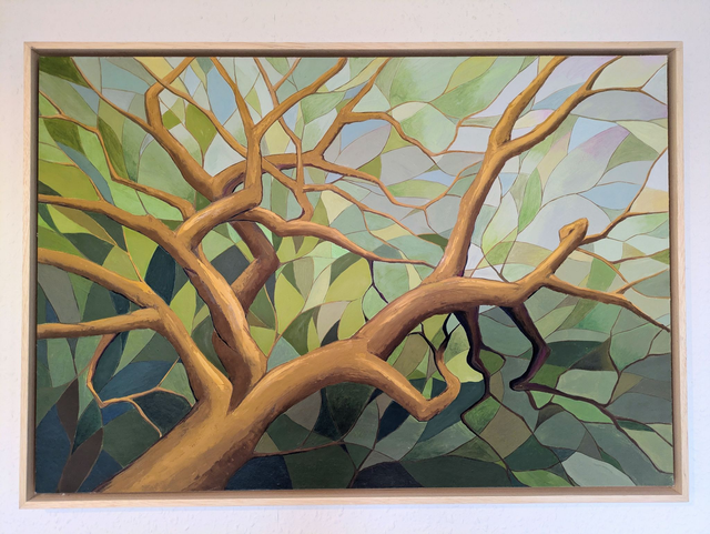 This tree can be found in Sydenham Hill woods - its a really good one for climbing on! The painting is oil over acrylic and is painted in a Mosaic stained glass window style in many shades of green.