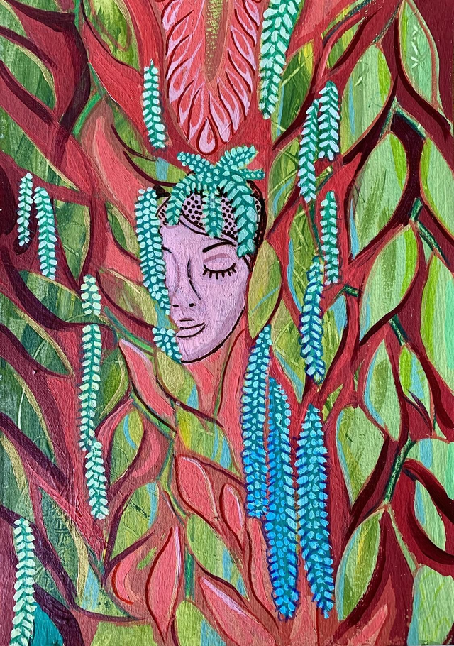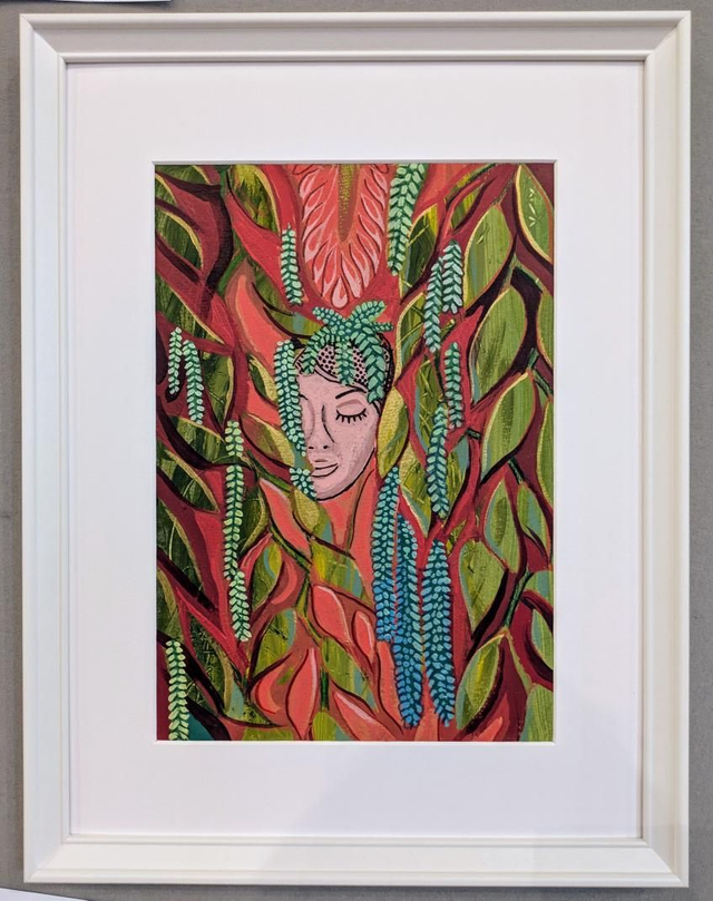 Original oil painting of Vallarta Botanical Gardens in reds and greens with gold highlights.