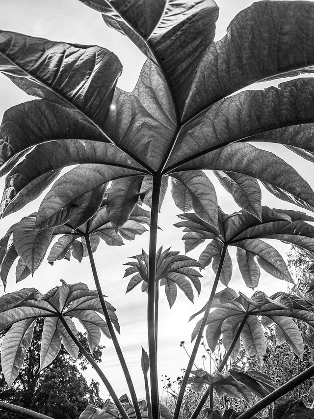 This huge plant was originally located outside the butterfly house, but was moved to near the fountain in 2025. This low angle shows the underside of the leaves against the sky.